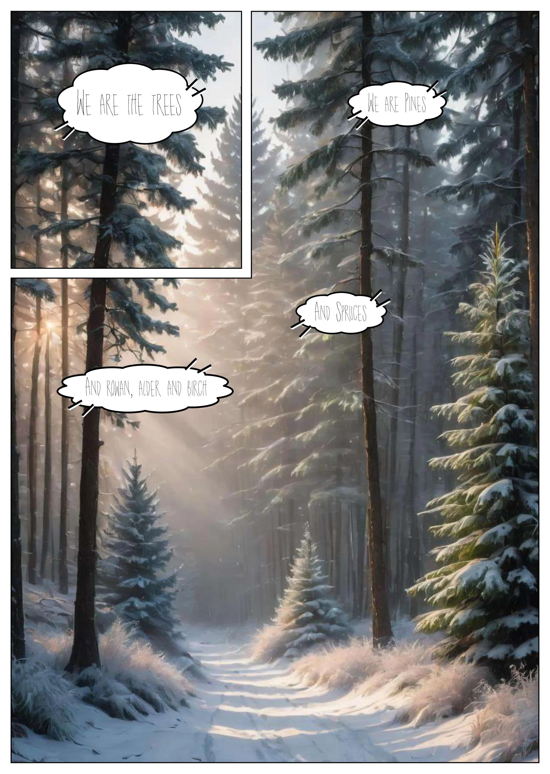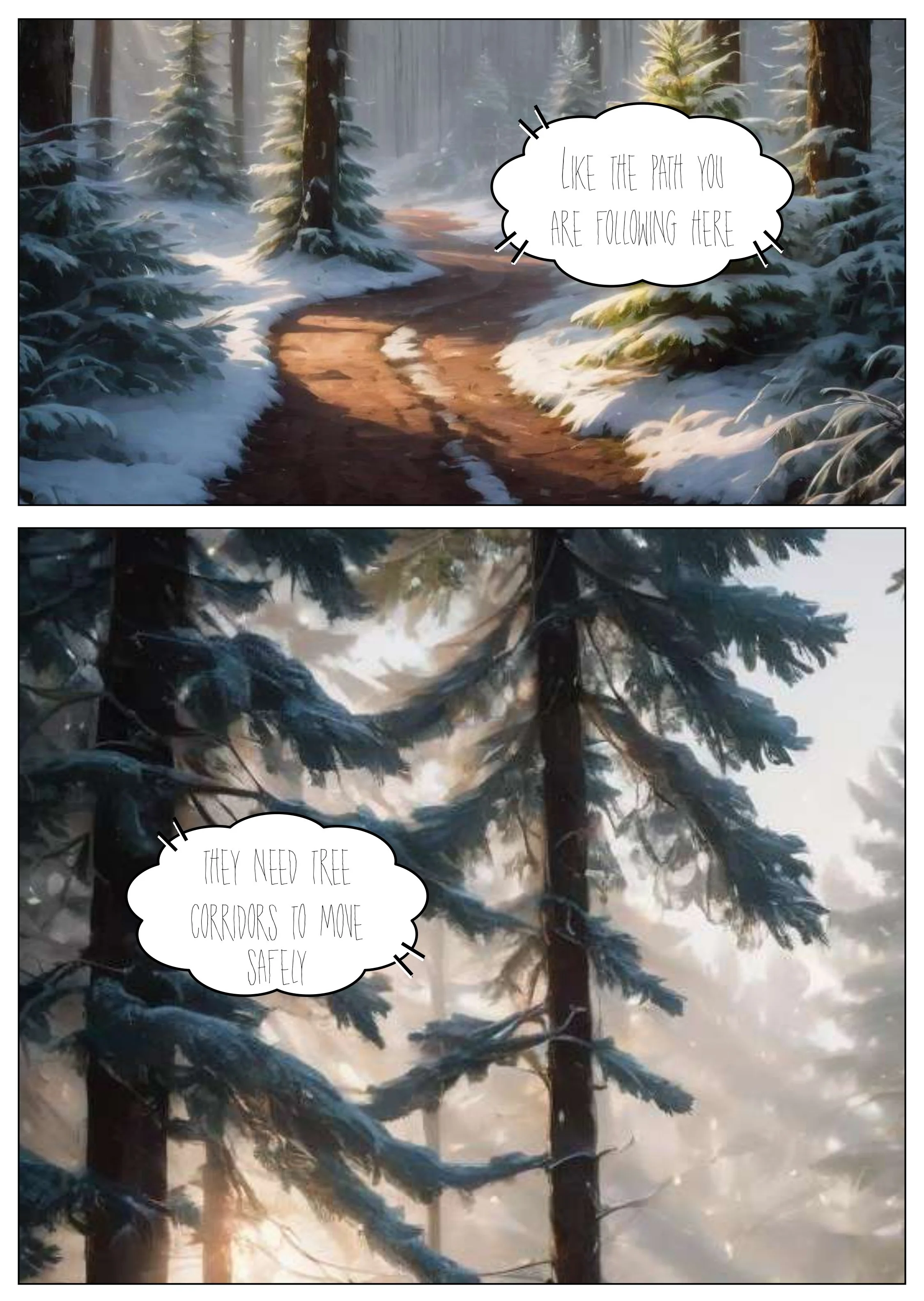 This comic aims to represent the spirit of the forest and its relations with both wild animals and humans.